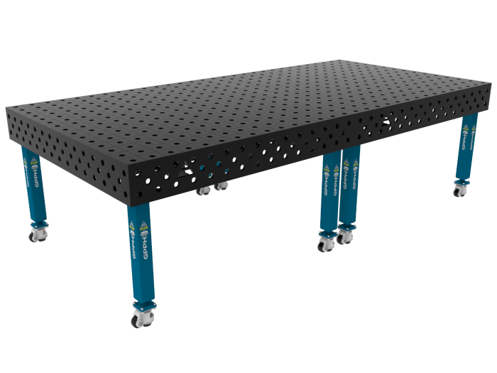 GPPH’s tables offer an incredibly stable and sturdy construction. The table top is made from 12MM thick material, this is outstanding when compared to the typical 6MM – 10MM that is usually used on lower end welding tables. In addition to this, the steel used is S355J2+N grade that is carefully selected. The steel is also unpickled so as to prevent the material becoming bright and causing arc to flash bounce off the table making the working conditions difficult for the welder. Finally, the tables are not coated with paint as it can make the surface difficult to conduct. They are coated with an oil based preparation which protects the tables during transport. Anti spatter is suggested.